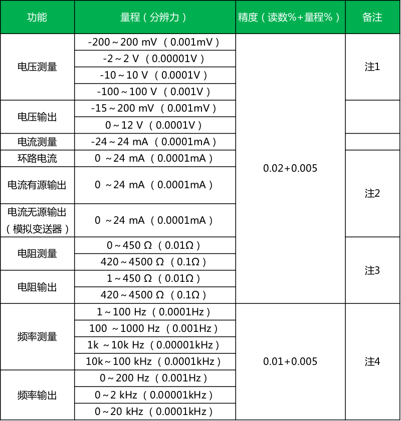 注3:电阻测量指4线测量,电阻测量指4线测量,2线、3线测量需另加0.02Ω的误差;